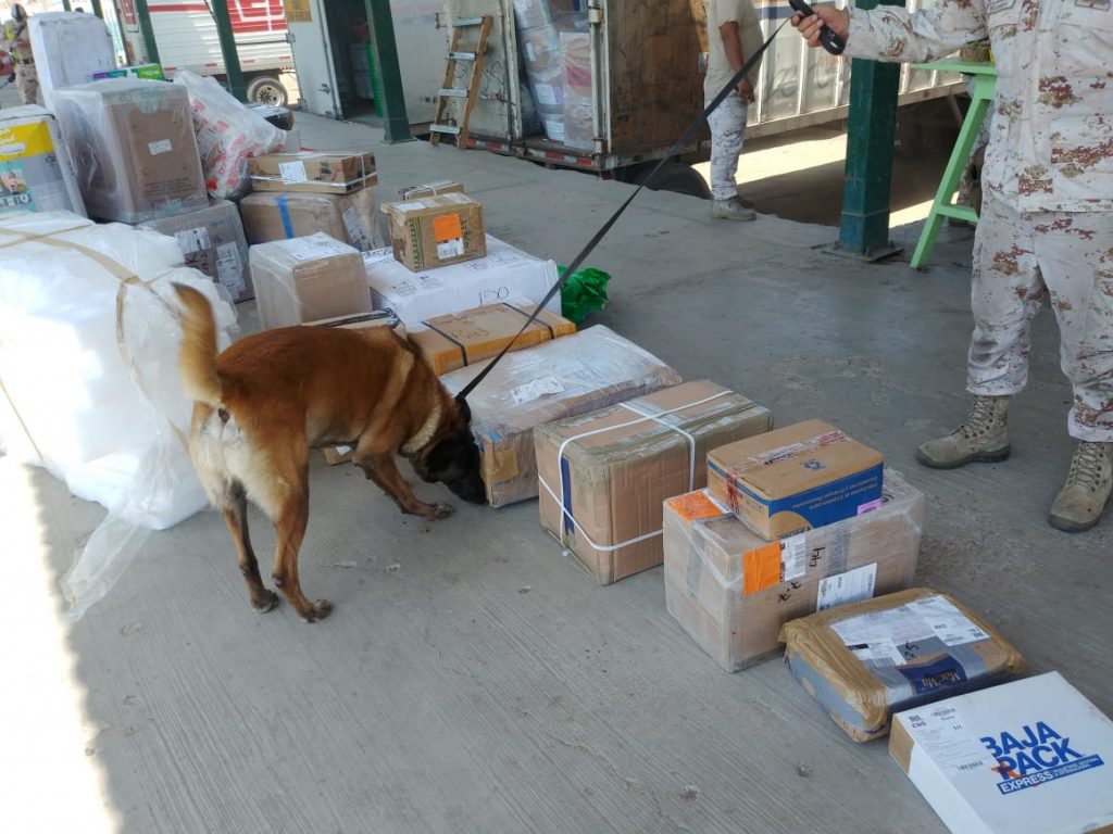 Esta acción se llevó a cabo en el interior del Recinto Portuario de Pichilingue, en La Paz, Baja California; cuando tres binomios caninos realizaron inspección rutinaria a un trailer de servicio de mensajería.