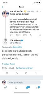 Ante este mensaje, la cuenta oficial de Twitter de la FGR respondió a la Araceli Benitez con el siguiente mensaje: “El peligro para México son personas como tú, sin un gramo de inteligencia”.