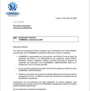 “Comprometida con la prevención del COVID-19, ante el riesgo de expansión del mismo, y en salvaguarda de los jugadores, cuerpo técnico, delegados, árbitros, dirigentes, prensa e hinchas, ha tomado la decisión de suspender los encuentros de la Conmebol Libertadores 2020 de la semana del 15 al 21 de marzo”, reza el comunicado.