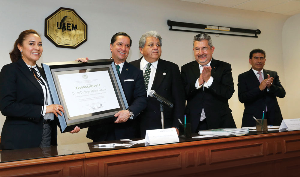 Por su notable gestión al frente de la Administración 2013-2017 de la Universidad Autónoma del Estado de México (UAEM), la Federación de Asociaciones Autónomas de Personal Académico de la institución (FAAPAUAEM) entregó al rector Jorge Olvera García un reconocimiento, avalado por los integrantes del Comité Ejecutivo, los 48 presidentes de asociación y los más de 7 000 afiliados a esta agrupación sindical.