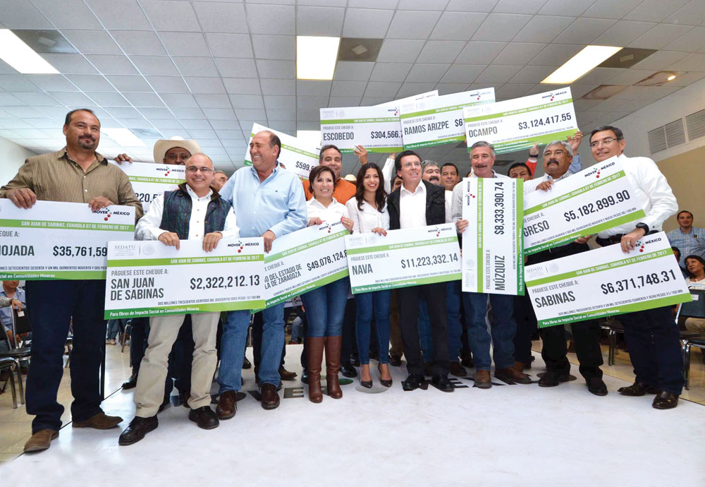 En la ceremonia, la administración de Rubén Moreira recibió de la titular de la Sedatu una partida de 49 078 124.81 pesos del Fondo Minero con la entrega de cheques a la alcaldesa de Nava, Gabriela Fernández, y a los ediles de San Juan de Sabinas, Sabinas, Múzquiz y Sierra Mojada.