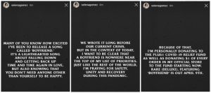 Más tarde, Selena Gomez compartió una foto de la caratula del álbum delux de Rare en su Instagram, junto a la información sobre cómo donar al fondo de ayuda PLUS 1 COVID-19, con el que la cantante está poniendo su granito de arena para la lucha contra el coronavirus.