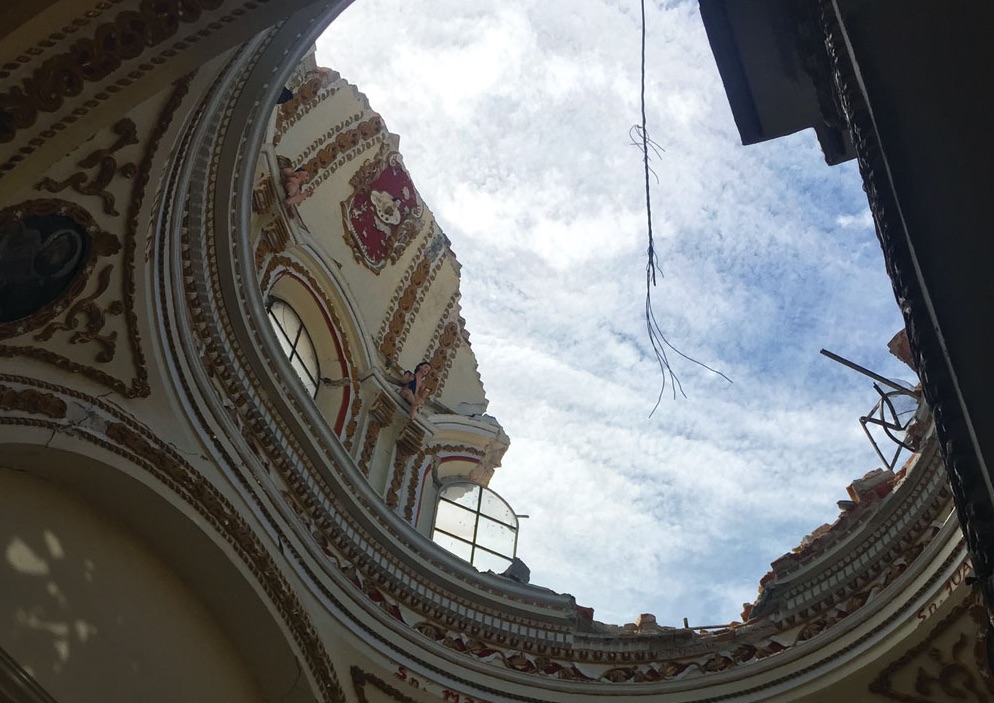 El templo es uno de los más dañados de San Pedro Cholula; la mitad del techo desapareció y el suelo está lleno de escombros. El señor Dionisio nos dice que por suerte no había nadie cuando tembló, aunque el Santo, el más importante, el mero San Cristóbal, se rompió. Sus pedazos están resguardados en un cuarto junto a la iglesia, en el primer piso. Mientras, en las bancas de la planta baja, los mayordomos y encargados de la comunidad dialogan para ver qué van a hacer.