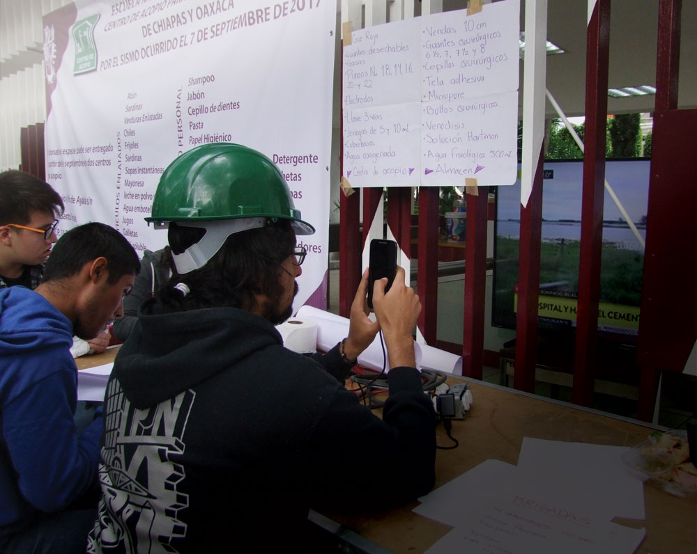 Desde las ocho de la mañana del miércoles 20 de septiembre, alumnos del Instituto Politécnico Nacional se reunieron a las afueras de la Escuela de Ciencias Biológicas, a unas cuadras del Metro Normal, linea azul. Toda la organización se llevó a cabo mediante Facebook –hora, lugar, lo que iban a hacer, lo que se debía llevar– y se coordinó en grupos de Messenger un día antes y la mañana del miércoles. 19 horas después del sismo que cimbró a la Ciudad de México, decenas de jóvenes acudían al llamado.