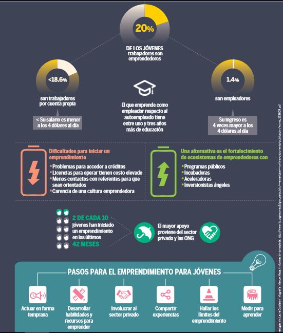 Los jóvenes de América Latina y el Caribe son un grupo vulnerable ante la marginación laboral. Carecen de experiencia profesional, así como de habilidades y recursos financieros y los pocos que logran trabajar distan de acceder a empleos de calidad, es por ello que el emprendimiento aparece como una oportunidad para la inserción laboral e incluso social.