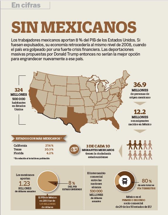 Los trabajadores mexicanos aportan 8 % del PIB de los Estados Unidos. Si fuesen expulsados, su economía retrocedería al mismo nivel de 2008, cuando el país era golpeado por una fuerte crisis financiera.
