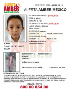 A través de la Alerta Amber de México las autoridades buscan al menos David Jaziel Báez Mejía de 9 años, mismo que desapareció el 26 de junio en Coahuila.