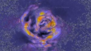En el mapa se ve una burbuja de material en el punto más meridional del cielo,con una gran ala de barrido que se va hacia el norte en un lado en la dirección de la constelación de Cetus y otro brazo más grueso opuesto en hacia la constelación de Apus (Pomarède et al.,ApJ, 2020).