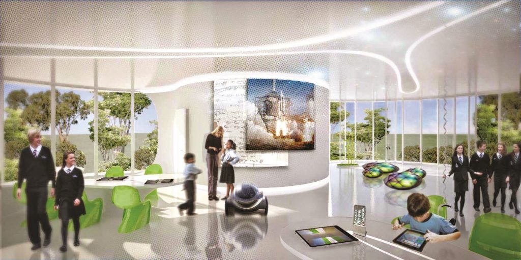 Sin espacios rígidos ni alineados, el aula del futuro es esencialmente flexible. Funciona entre iguales, así que tiene mesas modulares que se separan o se unen en una más grande (redonda o cuadrada) y tienen una superficie interactiva, en donde los alumnos y el maestro pueden compartir ejercicios y experiencias, y no sólo trabajar en su computadora personal.
