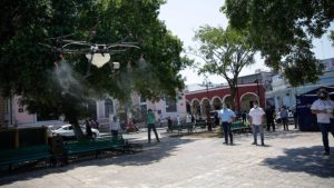El Ayuntamiento de Mérida, Yucatán, puso en marcha la sanitización de espacios públicos con drones como medida para evitar la propagación del coronavirus.