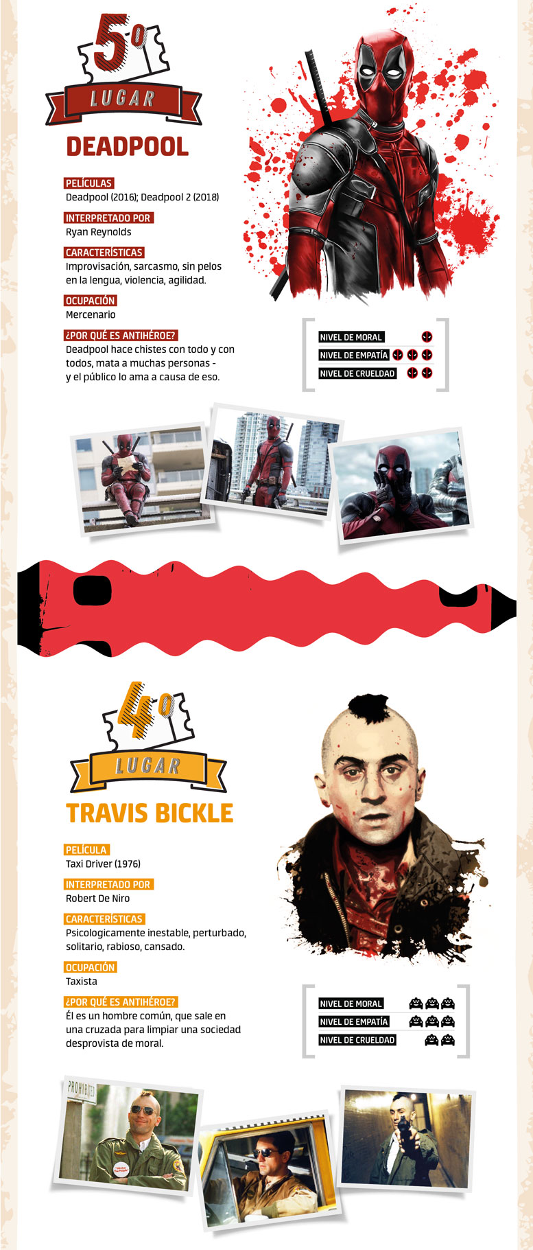 Del universo Marvel el antihéroe más seguido en el cine es Deadpool (2016-2018). Su manera divertida de ver su mundo, en medio de un plan de venganza por el hombre que le cambió la vida, tras un experimento para mejorar su salud, es la delicia de grandes y pequeños. Su crueldad va más allá del nivel 2. Los cinéfilos lo aman.