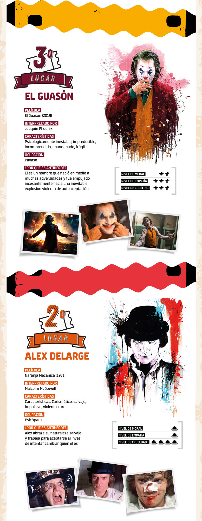 El segundo lugar en esta ‘maquiavélica’ lista de personas antihéroes es para Alex Delarge, el famoso más recordado del filme Naranja Mecánica, estrenada en 1971. En esta película, Inglaterra vio los errores, violencia, abusos y sadismo de una pandilla que llenó de miedo sus calles. En esa espiral de violencia estaba Delarge, carismático y salvaje a la vez, quien empujado por un conocido paró tras las rejas. De la cárcel salió, pero ya no era el mismo. Como boomerang, fue víctima y sus verdugos eran aquellos que no olvidaron su perversa mirada. En Delarge el nivel de crueldad es nivel 4.