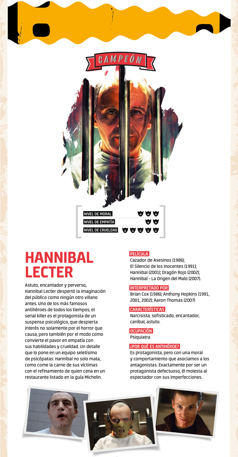 Por último, qué fuera del cine sin el maestro de la inhumanidad, el personaje inolvidable de la película El Silencio de los Inocentes: el psiquiatra Hannibal Lecter. La escala para medir llega solo al número 5 y fácilmente lo alcanza, para dejar atrás, en el camino del cine, a tantos antihéroes.