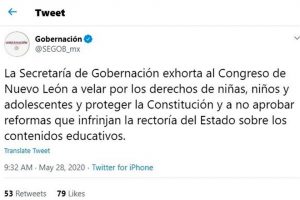 Por lo anterior, la Secretaría de Gobernación, a través de la Subsecretaría de Derechos Humanos, Población y Migración, Conapo y la Secretaría Ejecutiva del Sipinna nacional, hacen un llamado respetuoso y enérgico a las y los legisladores del estado de Nuevo León a asumir su responsabilidad pública como legisladores salvaguardando los derechos de niñas, niños y adolescentes por encima de sus creencias como padres y madres, velando por el Interés Superior de la Niñez reconocido en la Constitución Política de los Estados Unidos Mexicanos.