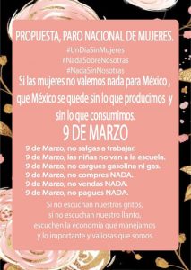 El gobierno no ha sabido dar solución a todos los feminicidios que han estado ocurriendo, las mujeres siguen protestando, quieren ser escuchadas y por medio de redes sociales han difundido el movimiento donde las mujeres dejaran de hacer actividades todo un día, aunque hay distintas fechas para el paro, algunos medios dicen que será el 8 y otros el 9 marzo.